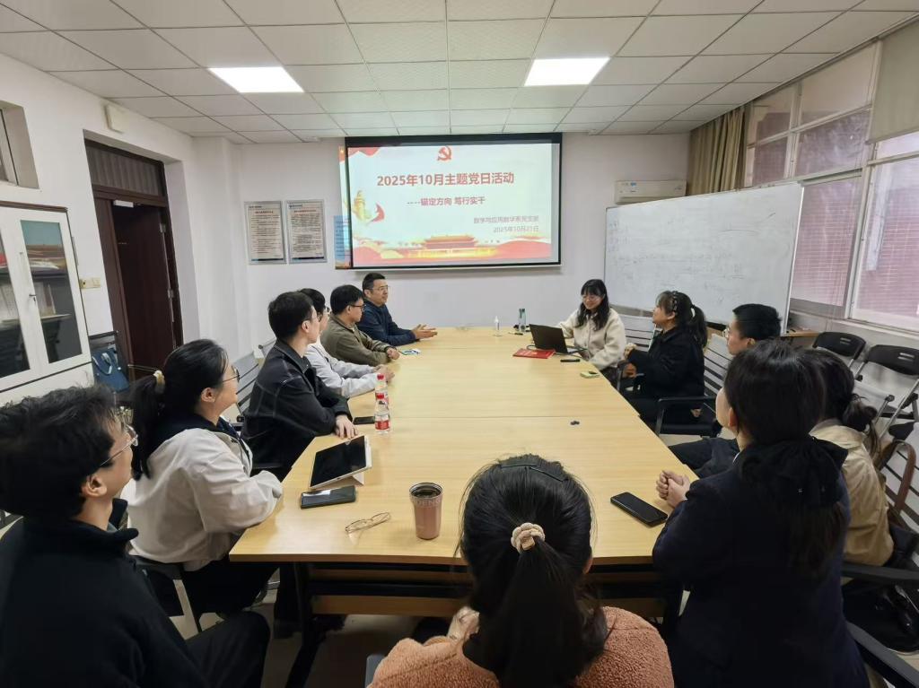 2025年10月21日,数学与应用数学系党支部召开“锚定方向 笃行实干”专题组织生活会,深入学习贯彻习近平新时代中国特色社会主义思想及党中央、省委、学校党委重要会议精神。会议由支部书记刘斯丽主持并领学,学院党委委员、系主任王芳与副院长胡海军作专题发言,支部全体党员参加学习。