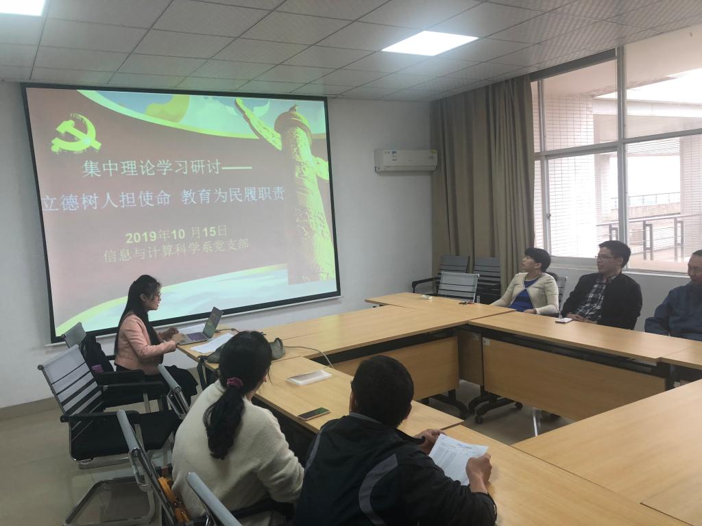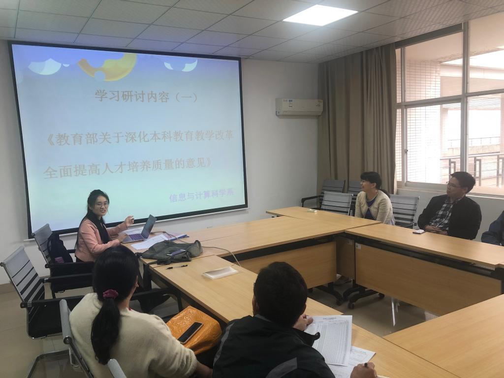 在“立德树人担使命,教育为民履职责”主题教育背景下,10月15日下午,信息与计算科学系党支部组织全系老师在教研室理科楼A502集中学习了《教育部关于深化本科教育教学改革全面提高人才培养质量的意见》以及《永利集团88304官网2019年度本科教育与人才培养工作考核指标体系》。会议由支部书记李姣主持。