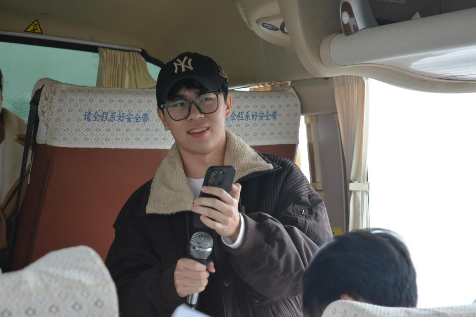 路途中,同学们开展“听歌识曲”游戏。每位同学都认真聆听着红色歌曲前奏,积极踊跃地抢答,气氛活跃。