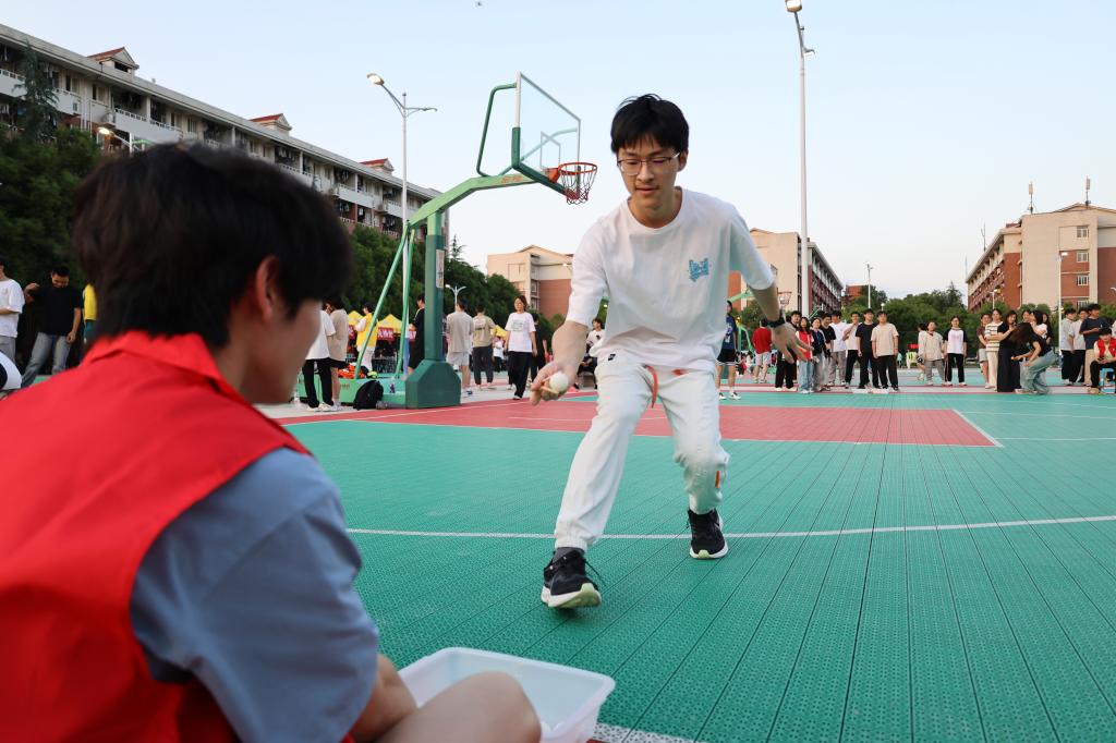 学社联同学的开场舞点燃全场,王学成的加油鼓劲、篮球赛冠军队土木学院的精彩三分球把运动会推向高潮。三分球挑战区秒变“欢乐之区”——每当有人投中,围观群众就会集体欢呼和加油助威;筷夹乒乓球区上演“手抖大师”合集,乒乓球逃跑的速度比早八人冲向教室还快;投壶比赛榜首投中33支,简直就是长理“神投手”;“你画我猜”的默契配合、“疯狂快递员”的障碍冲刺、“四人五足”的团队协作,无不展现着室友们的默契、智慧与活力,让整个至诚轩社区篮球场成为欢乐的海洋,现场笑声不断。