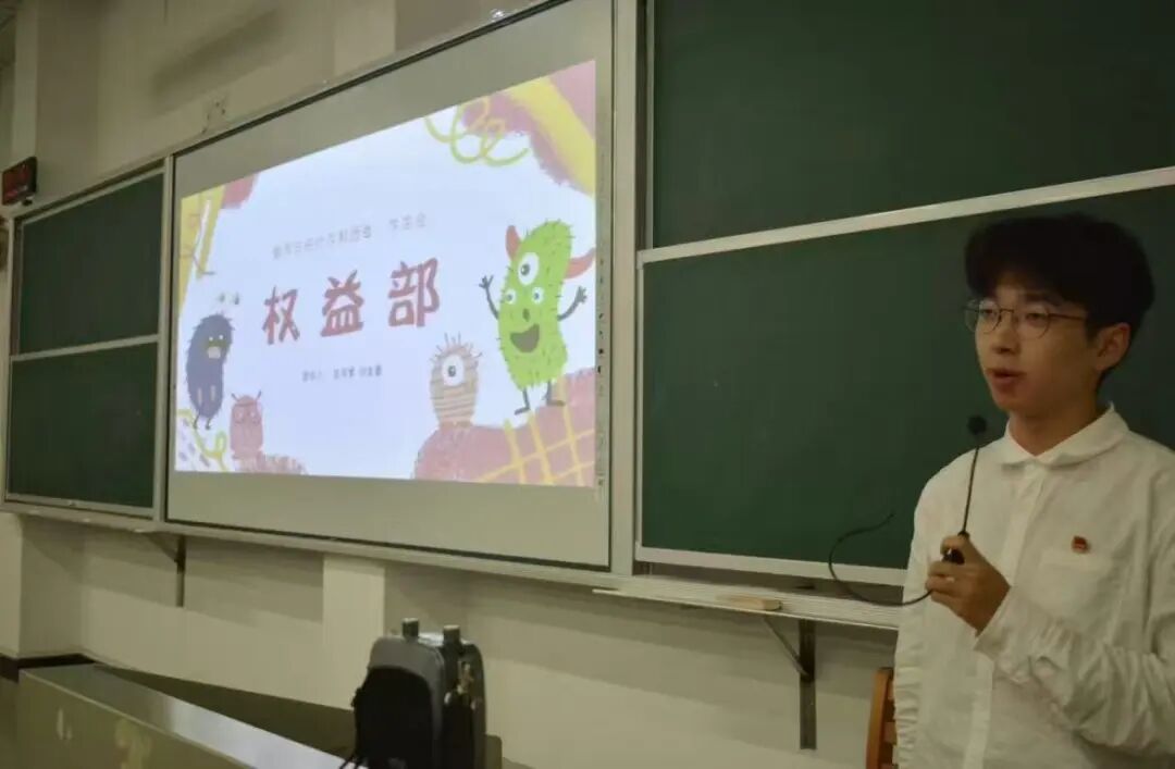 随后,由轮班主席刘奕涵进行发言,他结合自身经历,从技能、生活、人际三大方面讲述了自己加入团学的改变和收获,鼓励大家积极参与团学干部竞选,加入团学大家庭。