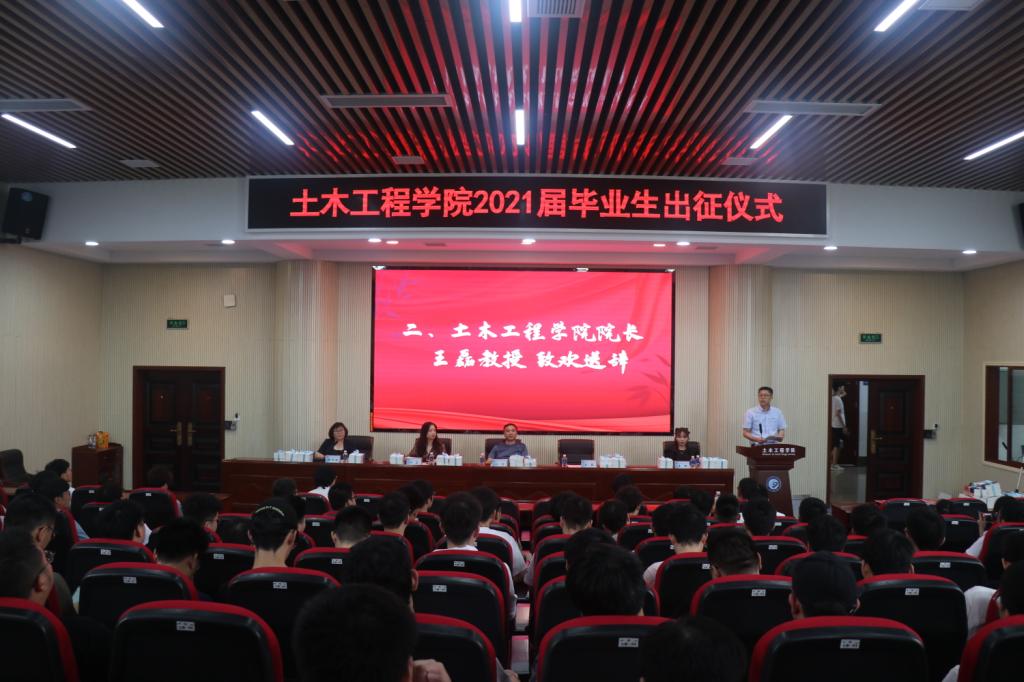 出征仪式上,土木工程学院院长王磊教授代表学院向学有所成,即将告别母校、踏上新征途的毕业生们送上了热烈的祝贺和衷心的祝福!王磊先是带领大家共同回顾学院四年来所取得的一系列辉煌成就,随后语重心长地提出三点寄语:一是希望同学们抱着终生学习的理念,练就过硬本领。二是希望同学们耐住寂寞、守住初心,以奋斗的姿态服务祖国、服务人民。三是希望同学们轻装上阵、磨炼意志,乘风破浪、久久为功。最后王磊表示土木学院永远是你们的家,期待大家常回家看看!