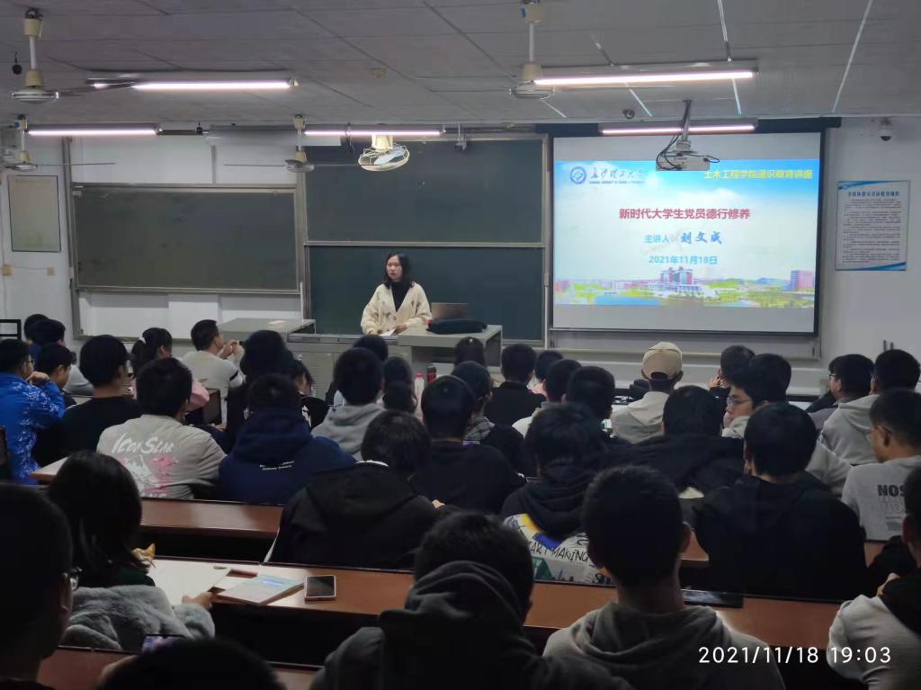 1118,土木工程学院在金盆岭校区12415开展了主题为《新时代大学生党员德性修养》通识教育讲座。本次讲座特邀土木工程学院学工办刘文成老师主讲,共计120余名学生代表参加聆听。