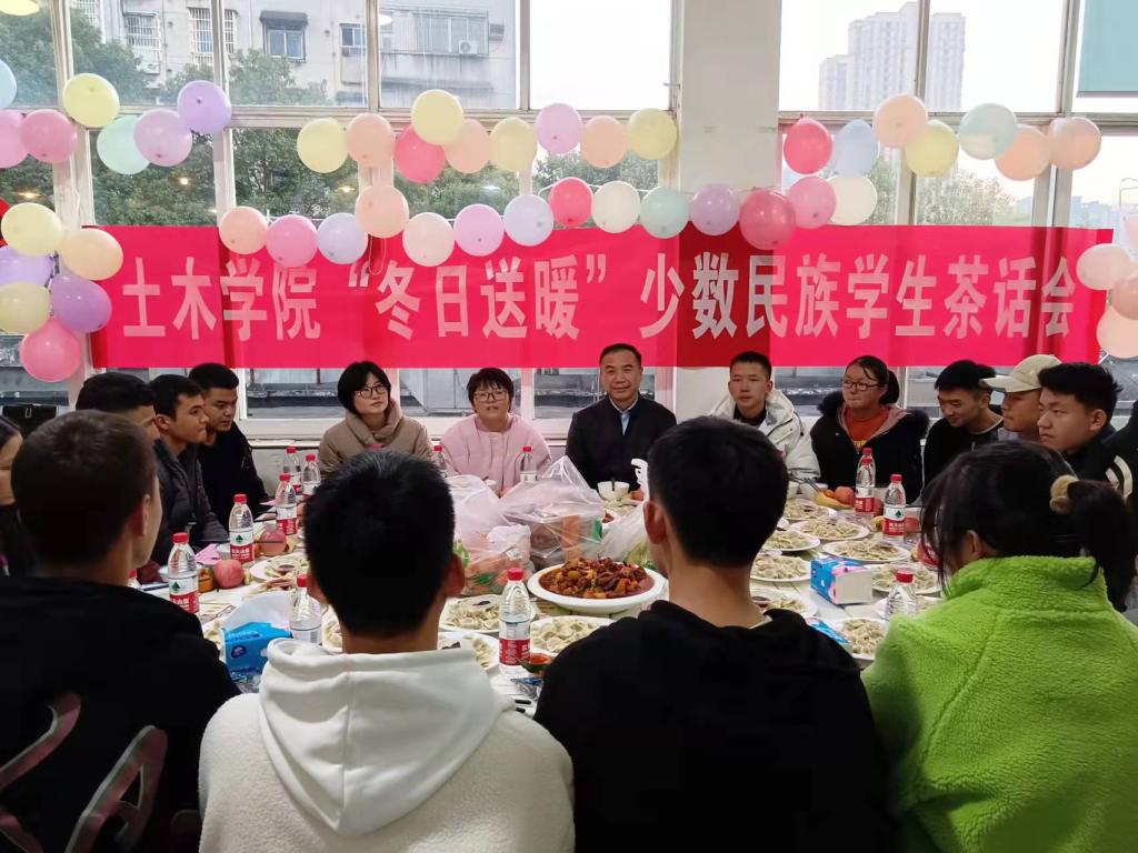 12月21日,时值冬至。永利集团88304官网金盆岭校区西苑食堂民族餐厅里暖意融融,在这里正在举办一场别开生面的“冬日送暖”少数民族学生新年茶话会。土木学院党委书记江河、副书记黄阿明、全体辅导员老师们与西藏、新疆籍的少数民族学生共度冬至节,师生一起吃饺子、话家常、送车票、迎新春。