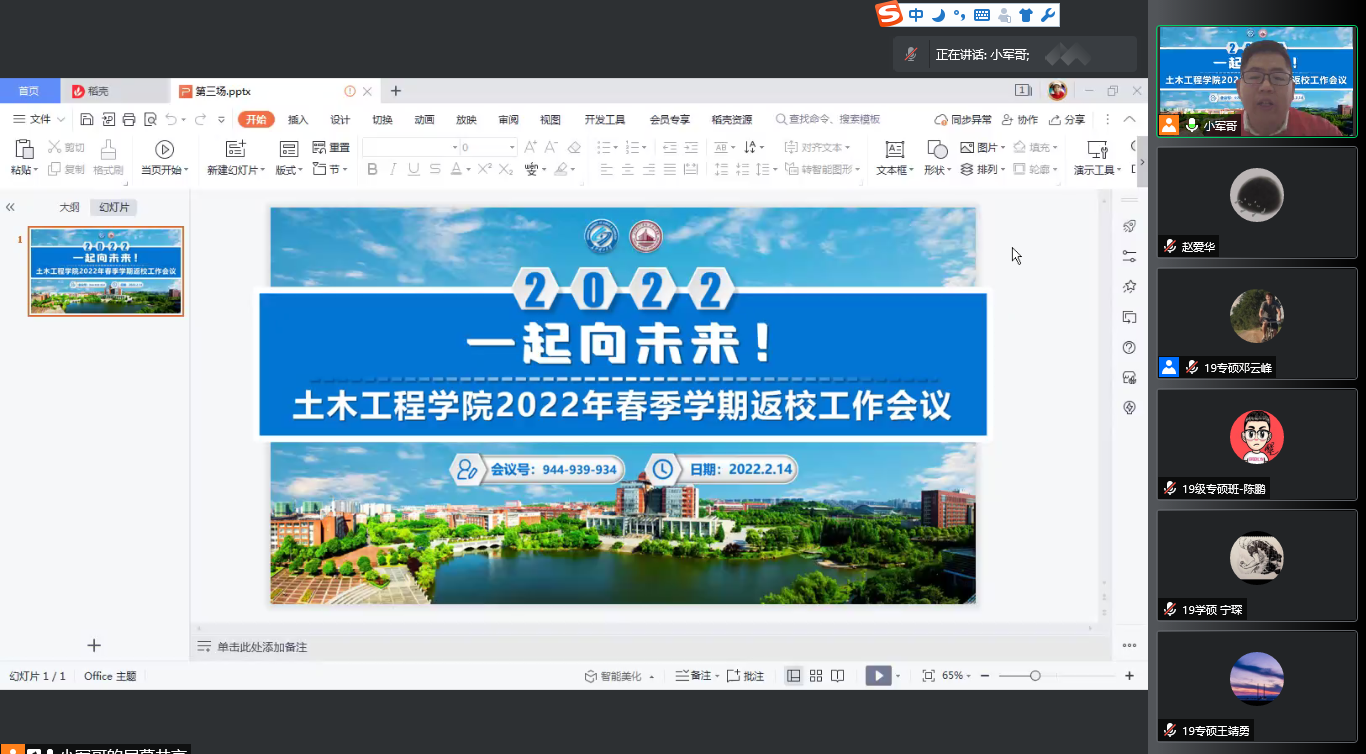 为贯彻落实学校开学工作视频会议精神,切实做好2022年春季学期研究生开学返校等相关工作,2月14日,土木工程学院分年级、分批次召开2022年春季学期研究生返校工作视频会议。学院硕、博士研究生全覆盖通过腾讯会议平台参加会议,辅导员李小军老师主持会议。