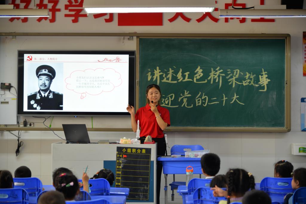 在讲述南昌起义时,宋昱欣播放了电影《建军大业》中的片段,“视频中我们可以看到革命前辈为了组建自己的军队,不惜献出生命,事实上在后来许许多多类似的战斗中,还有千千万万个这样的革命前辈,他们为了让人们过上幸福快乐的生活,无私奉献,英勇斗争,鲜血染红了桥梁,红桥就这样出现了,其中所体现的精神将永远地传承下去。”