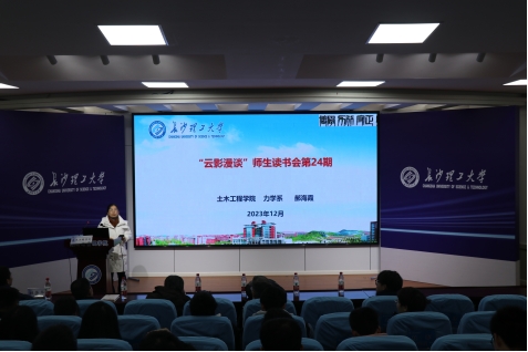 12月20日晚,土木学院力学教工党支部在金盆岭校区十二号教学楼200教室举办全国样板党支部特色品牌活动之“云影漫谈”(第24期)师生读书会。永利集团88304官网图书馆馆长杜荣华教授应邀主讲,土木学院力学系师生党支部成员、2023级辅导员和学生代表共210余人参加了此次读书会。读书会由力学系支部书记郝海霞主持。