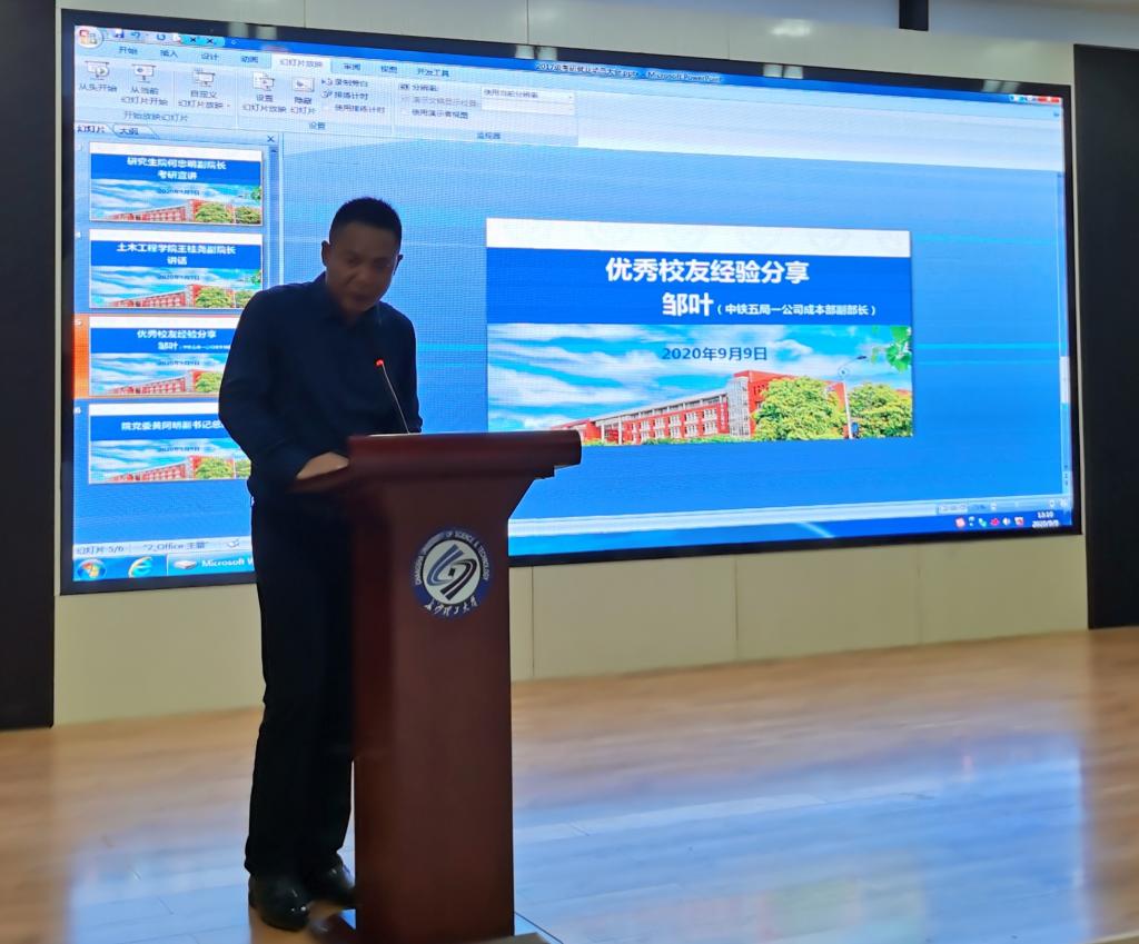 邹叶向同学们介绍了自己就职的中铁五局公司的情况,并与大家交流了工作心得,他结合自己工作初期的施工经历以及工作七年的升职情况,让同学们更加明晰了行业发展的前景与外部环境的变化。他强调一定要提前做好个人职业规划,加强自我认知并不断学习,以足够的底气参加就业招聘。