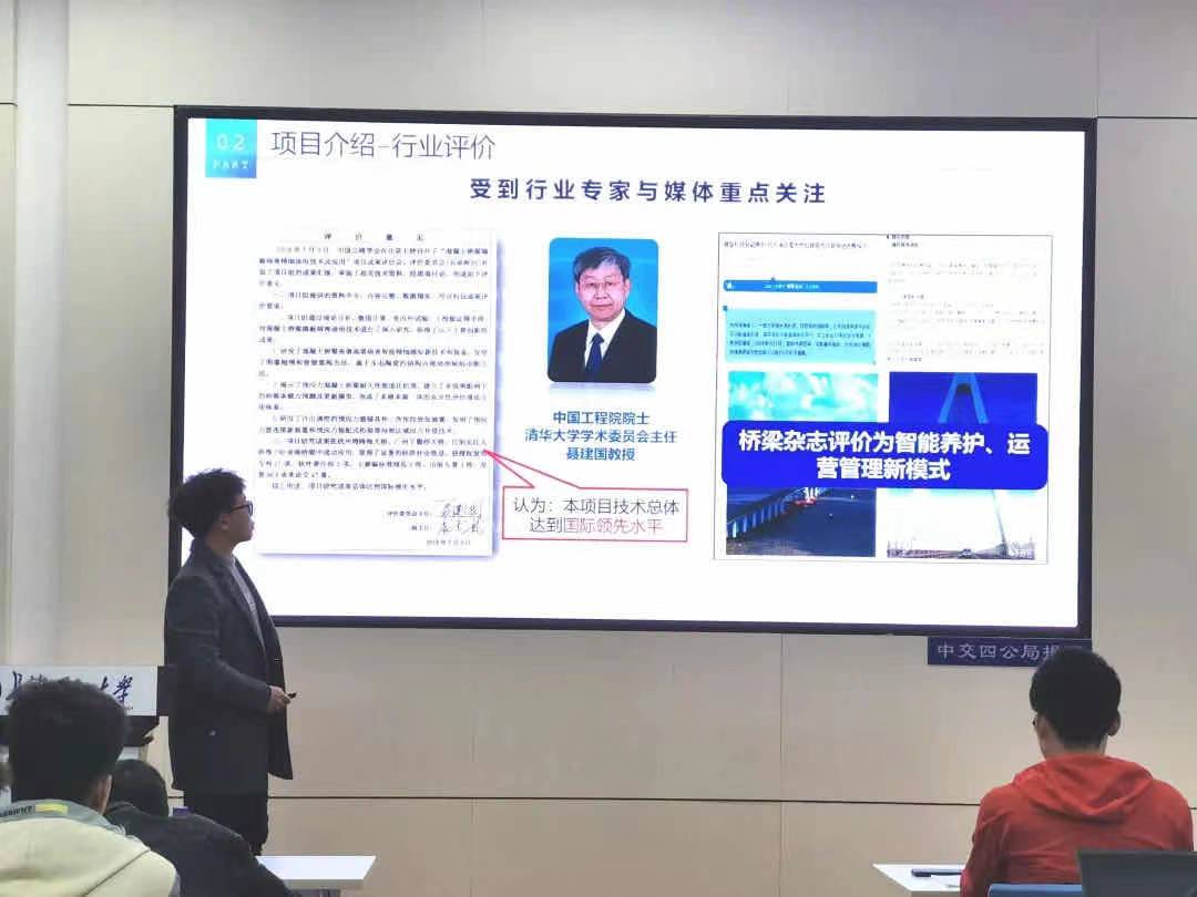 本次答辩会共有六个项目。首个出场队伍展示的项目为“‘云监工’——可视化工程项目监理平台”,汇报人分析了中国工程项目的现状及发展需求,通过对市场的研究推出了开拓计划等规划,评委老师表示该项目要充实其实质内容,PPT要做得规整,不能太过杂乱。“安全运维卫士——独创的混凝土桥梁病害智能诊评治一体化平台”项目针对提出了全球首创桥梁诊评治一体化服务平台,显著推动了桥梁工程行业的科技进步。