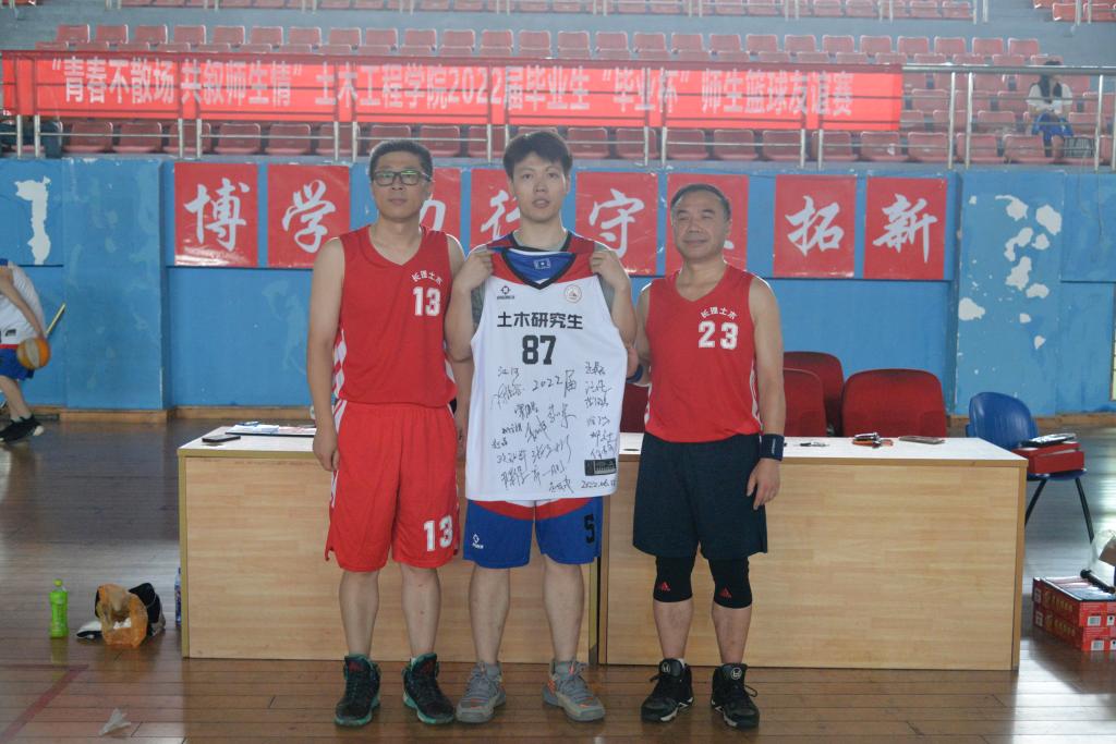 中场时刻,现场举行了师生三分球投篮大赛和毕业签名球衣赠送仪式。三分投篮大赛分教工队和学生队,每队派出三名队员参赛,参赛选手要分五处定点投篮,在两分钟内投完10个球,累计进球数最多为胜者。最终,本科生代表队杨川同学以6球的优异成绩荣获“三分王”。在毕业签名球衣赠送环节,全体教师球员逐一在纪念球衣和篮球上签字,江河和王磊代表学院向毕业生代表赠送了签名球衣和篮球,并合影留念,寄托了学院对2022届全体毕业生早日成才的祝福和期望!