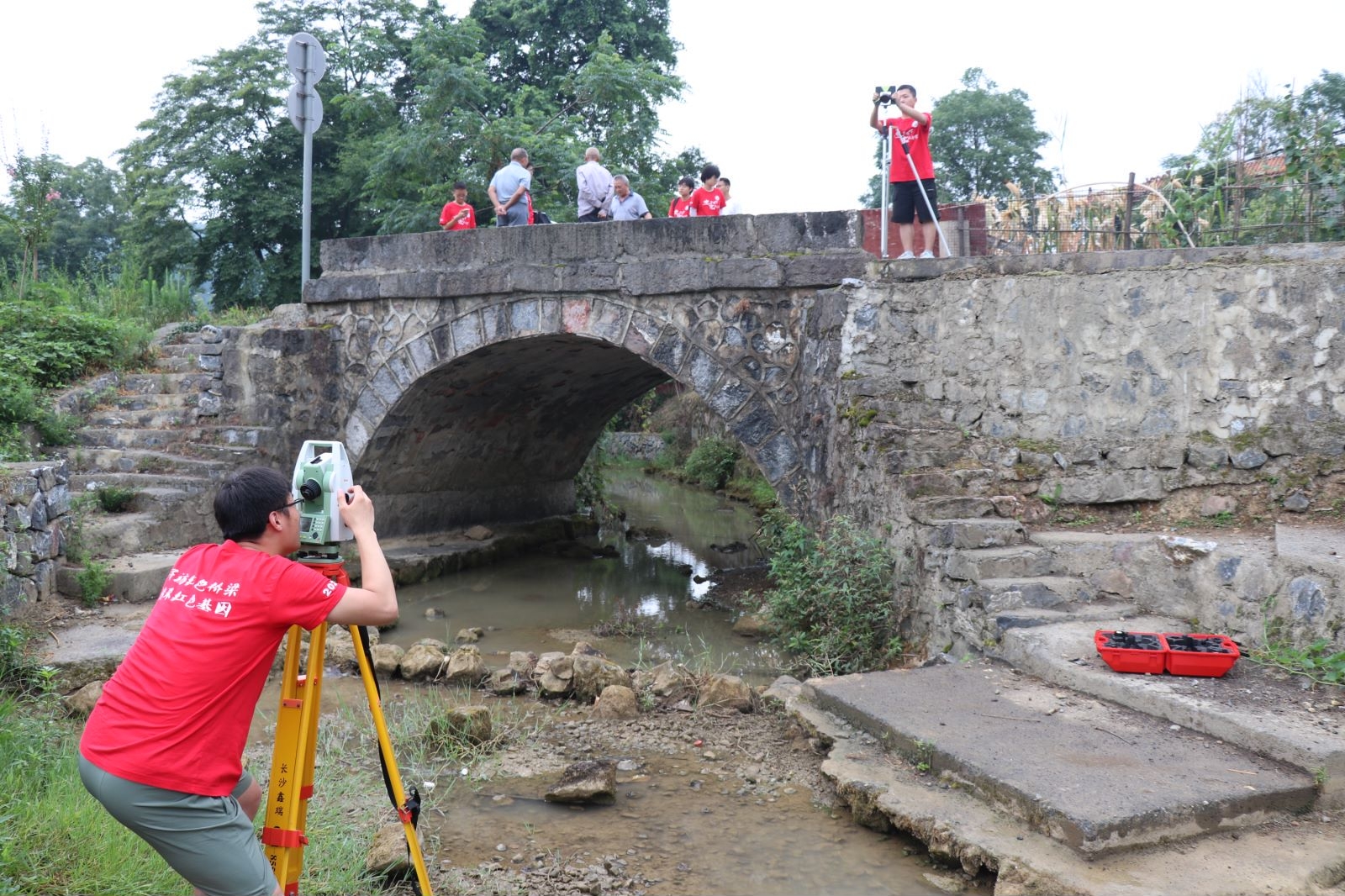 服务团充分发挥专业优势,将土砖房、木石房、砌体结构、石拱桥、梁桥和老旧受损的砖混结构房屋作为检测重点,同时现场排查新建房、改扩建房的安全隐患,做到“应检尽检”。服务团成员们顶着近四十度的室外高温,通过全站仪、高性能相机、回弹仪、水准仪等专业仪器对存在安全隐患的自建房的材料强度、整体倾斜度、变形和沉降程度进行了专业的检测和评估。
