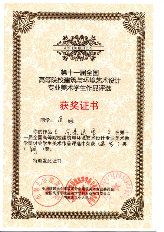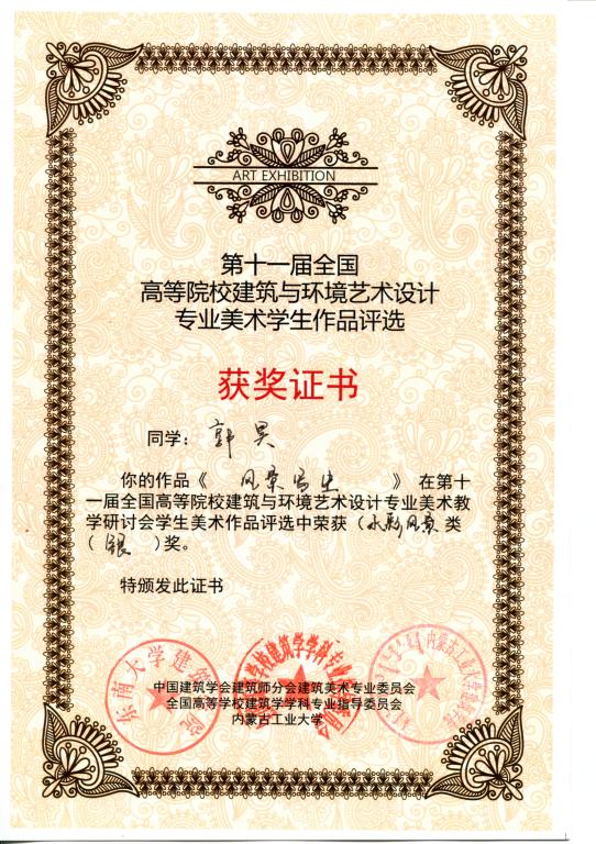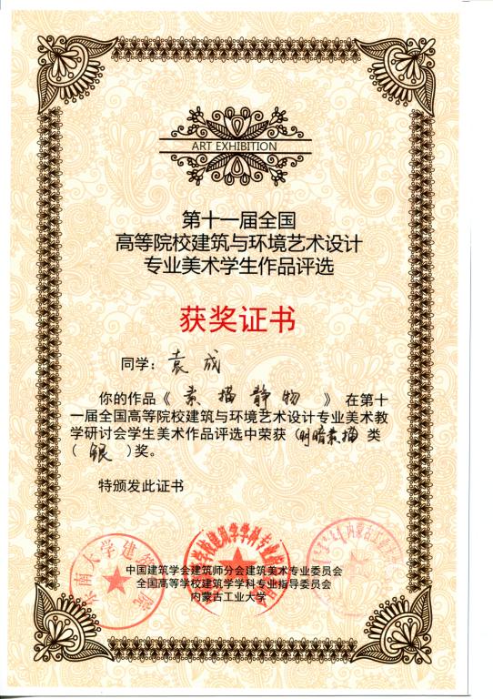 2011年9月22—26日,在内蒙古工业大学召开的第十一届全国高等院校建筑与环境艺术设计专业美术教学研讨会上传来喜讯,永利官网郭昊、袁成、周旭三位同学的作品分获风景写生类银奖、素描静物类银奖和风景速写类铜奖。指导老师李洁、殷俊、周志高、池春雷。这是由全国高等学校建筑学科专业指导委员会、中国建筑学会建筑师分会建筑美术专业委员会以及内蒙古工业大学联合组织和承办的第一次全国高等院校学生建筑美术作品评奖,在100多个院校入选的400多幅作品中由专家评定产生。另,永利官网学生郭昊、袁成、周旭、罗璇、唐荞菀、樊改霞、段红琪、王丛等八位同学的作品入选编入由中国建筑工业出版社出版的《学生作品集》,对这些同学表示祝贺!