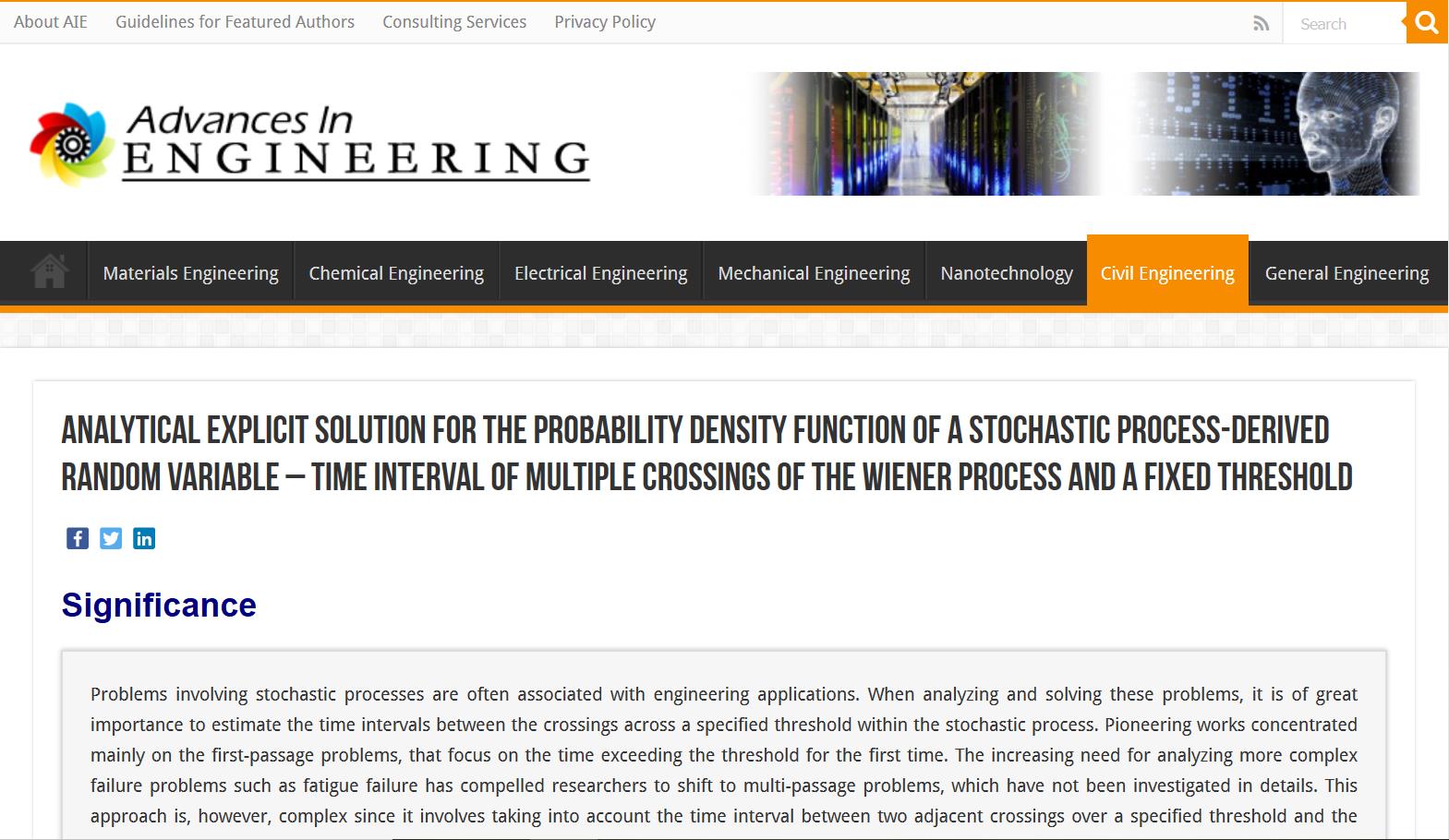 近日,我院张振浩副教授课题组发表在国际权威期刊《Mechanical Systems and Signal Processing》(中科院分区TOP期刊,影响因子5.005)上的论文“Time interval of multiple crossings of the Wiener process and a fixed threshold in engineering”被全球著名科技媒体机构“工程进展”(Advances in Engineering,AIE)遴选为关键科学文章(key scientific article),并以“Analytical explicit solution for the probability density function of a stochastic process-derived random variable – time interval of multiple crossings of the Wiener process and a fixed threshold”(一个由随机过程派生的随机变量-“Wiener过程与固定界限多次交叉时间间隔”的概率密度函数解析显示解)为题进行了报道。