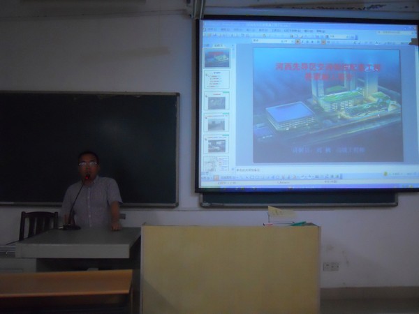 6月23日晚上19:30点,在云塘校区工科二号楼B606多媒体教室,长沙先导公共设施投资建设有限公司副总经理、高级工程师刘枫受邀为2012级卓越班和桥梁工程系老师做了题为“河西先导区交通枢纽配套工程桥梁施工简介”的学术讲座。讲座由桥梁工程系夏桂云教授主持,参加讲座有杨美良教授等老师。