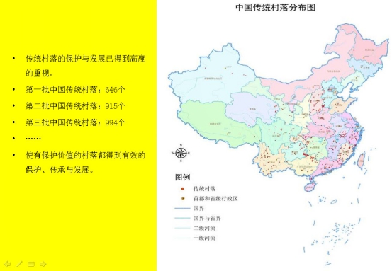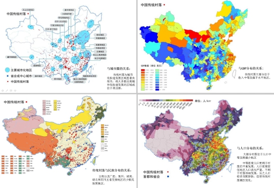 在传统村落现状这部分中,许建和老师给出了中国传统村落的具体数量。并分析了传统村落与各个层面的关系。其中,包括村落与城市圈的关系:传统村落与城市化快速发展区域显著负相关,绝大多数远离城市化快速发展的区域或位于其边缘。传统村落与GDP分布的关系:传统村落大部分位于收入中等及偏下水平地区。传统村落与民族分布的关系:云南以及广西、贵州、湖南、湖北和四川五省交接地区的少数民族聚集区。 传统村落与人口分布的关系:大部分村落位于人口中等及稍偏少地区中等密度人口更利于村落的平衡发展,人口密度较低地区人口流失严重,不利于村落持续发展,反之人口较多则更新快,促使传统村落剧烈变化。