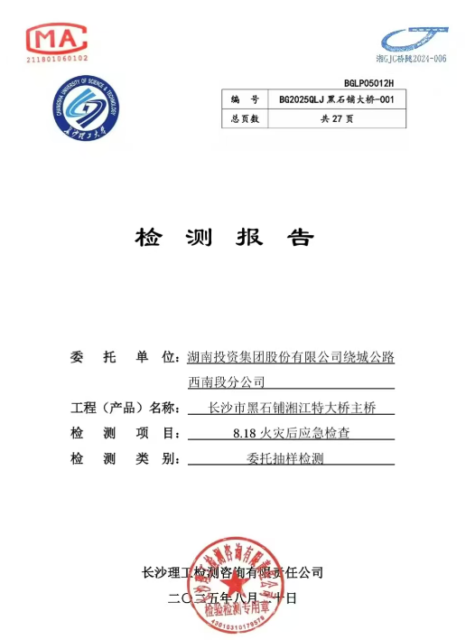 2025年8月18日18时43分,G0401长沙绕城高速西南段K51黑石铺湘江特大桥桥下施工区域,因防尘土工布燃烧引发火情。该桥2004年4月建成通车,至今已安全运营21年。火情发生后,桥梁安全成为公众关注的焦点,桥梁管理单位第一时间委托长沙理工检测咨询有限责任公司对桥梁进行安全检测。永利集团88304官网土木与环境工程学院建工系王中强老师主导完成了对黑石铺湘江特大桥主桥的火情现场调查、吊杆索力、拱肋变形及桥面线形测试,出具了《长沙市黑石铺湘江特大桥主桥8·18火灾后应急检查报告》。
