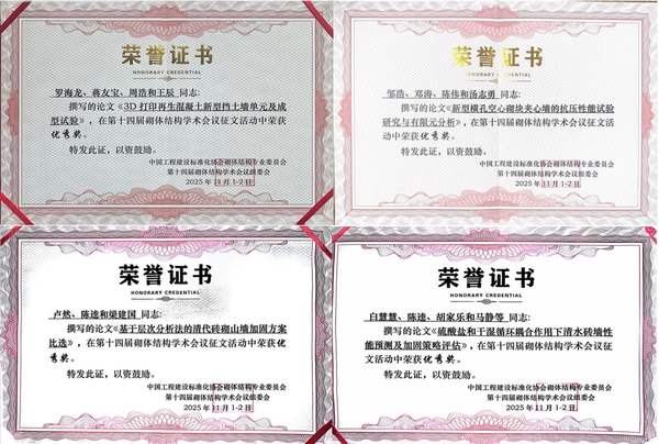 我院作为主要协办单位,高度重视此次学术交流契机,组织杨伟军教授、梁建国教授、蒋友宝教授、杨春侠教授、张振浩教授、陈伟副教授、董帅副教授、陈逵博士等共计21名师生参会,深度融入学术会议各项环节。梁建国教授以我国烧结砖建筑的历史贡献及新时代发展为主题作报告,梳理行业发展脉络并展望未来方向;蒋友宝教授围绕“3D 打印混凝土异形部件受力性能与储能墙体研究作报告,分享前沿技术探索成果;徐冲博士生、罗海龙硕士生也分别结合近期研究进展作报告,解析学术理论与实践应用路径,四篇报告均获得参会专家的高度认可。此外,我院师生的研究成果在本次会议论文评选中斩获佳绩 ——“3D 打印再生混凝土新型挡土墙单元及成型试验4篇论文,经会议学术委员会严格评审,获评第十四届砌体结构学术会议优秀论文奖,充分彰显了我院在砌体结构领域的科研实力与创新水平。