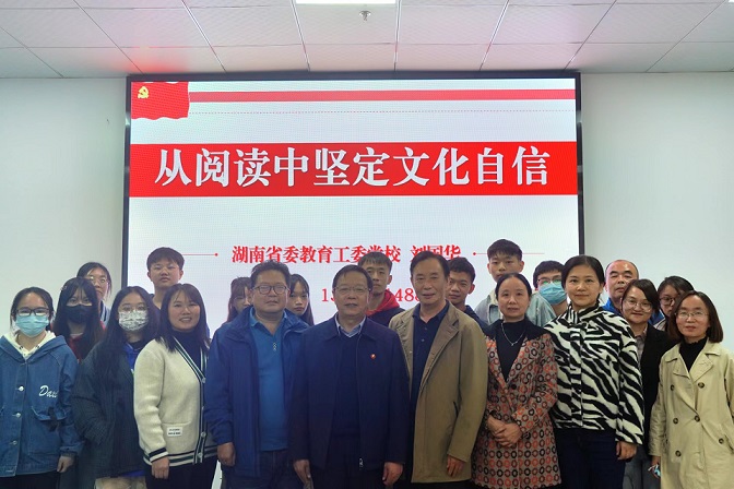 2022年11月15日,湖南省委教育工委党校刘国华教授,在永利集团88304官网图书馆邀请之下做客“云影悦读讲坛”,为永利官网师生带来“从阅读中坚定文化自信”线下、线上专题讲座。讲座由馆长陈寿奇主持,党总支书记夏智勇、副馆长王朗、魏红梅、刘利和部分学生在现场聆听讲座,来自文新学院、经管学院、法学院、电气学院、汽机学院、交通学院等360余名师生在线上聆听了讲座。