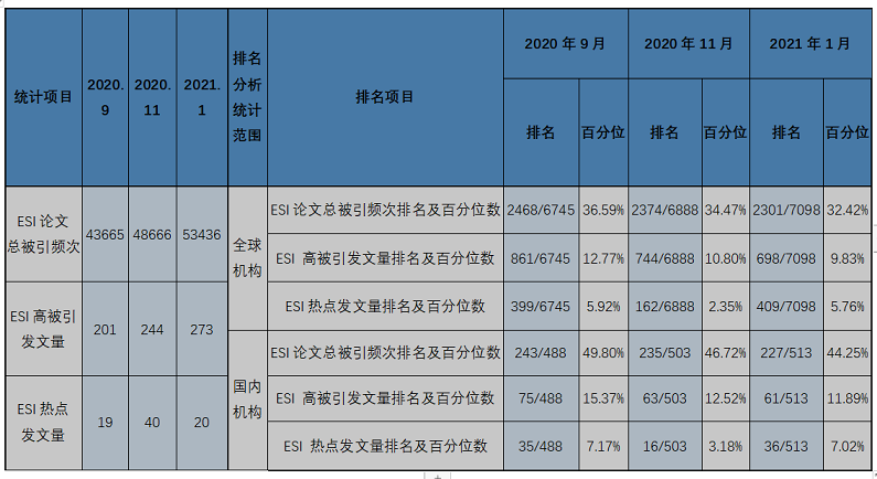 二、永利集团88304官网ESI高被引、热点论文排名统计与近三期对比分析  可以看出: 1.从量上来看:将ESI2021年1月数据与前两期对比,永利官网ESI论文总被引频次和高被引发文量都持续增加。其中,ESI论文总被引频次本期比上期增加4770,增幅为9.8%。 高被引发文量也持续增加,本期比上期增加29篇,增幅位11.89%。热点发文量有起伏,本期较上期减少20篇(本期数统学院高被引论文107篇,对永利官网ESI高被引发文量贡献最大; 材料学院热点论文9篇,对我校ESI热点发文量贡献最大。) 2.从排名来看:无论在全球机构中还是在国内机构中,永利官网ESI论文总被引频次和高被引发文量的排名及百分位数都持续进步(百分位数值越小,排名越靠前), 不但排名的绝对位数在上升,而且相对位数也在提升。 本期永利官网ESI论文总被引频次在全球7098个机构中,排名2301;国内513个机构中,排名227。 本期高被引发文量在全球7098个机构中,排名为698;国内513个机构中,排名61。 本期热点发文量在全球7098个机构中,排名409;国内513个机构中,排名36。 永利集团88304官网图书馆信息服务部 电话0731-85258711 |