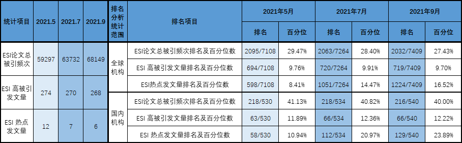 1)永利官网ESI论文总被引频次近三期在持续增加。其中,7月比5月增加4435次,增幅为7.48%,9月比7月增加4417,增幅6.93%。