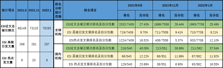 1) 永利官网ESI论文总被引频次近三期持续增加。其中,11月比9月增加4984次,增幅为7.31%。2022年1月比2021年11月增加5150次,增幅为7.05%。