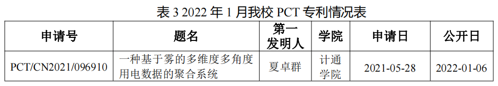 2022年1月,永利官网作为第一申请人,申请PCT专利共计1件,如表3所示。