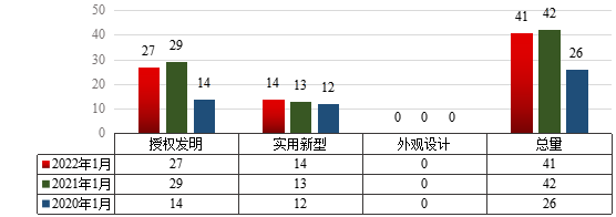 图2 2022年1月永利官网授权专利类型分布及近两年同期授权情况