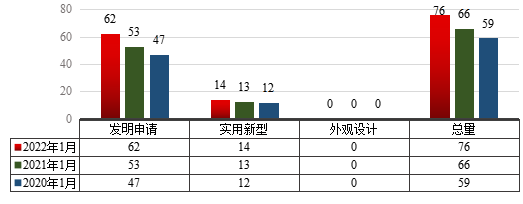 依据智慧芽专利数据库中检索到的各国官方公开专利申请数据,2022年1月,永利集团88304官网作为第一申请人申请的专利共计76件。其中发明专利申请62件,占申请总量的81.58%;实用新型专利申请14件,占申请总量的18.42%;外观设计专利申请无。