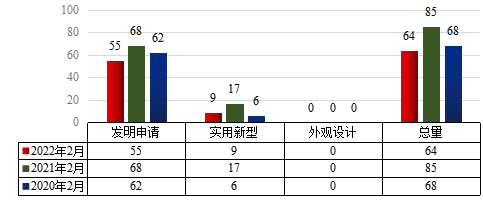 图1 2022年2月永利官网专利申请类型分布及近两年同期申请情况