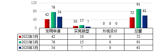 图1 2022年3月永利官网专利申请类型分布及近两年同期申请情况