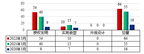 依据智慧芽专利数据库中检索到的各国官方公告专利授权数据,2022年3月,永利集团88304官网作为第一专利权人被授权的专利共计64件,其中授权发明54件,占比84.38%;实用新型专利授权10件,占比15.63%;外观设计专利授权无。