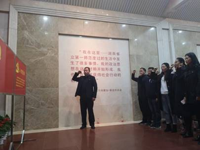 第一师范是毛泽东的初心形成地和毛泽东思想的萌芽地,青年毛泽东在此求学、执教以及从事早期革命活动。学院党总支章罗庚书记在纪念馆展厅的序厅,带领全体党员对着鲜红的党旗,重温入党誓词,再次铭记入党初心,慷慨激昂的声音响彻大厅,把大家学习的气氛一下子就调动起来了。