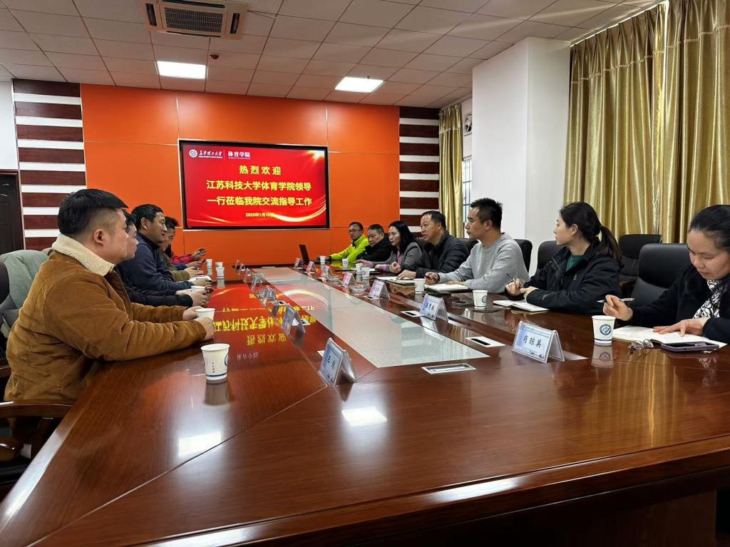 2025年1月10日,江苏科技大学体育学院副院长王长征、赵长征以及场馆中心主任杨威一行莅临永利集团88304官网体育学院,进行交流指导活动。永利集团88304官网体育学院党总支书记李龙、副院长潘红玲、谭志华及相关人员热情接待了来访嘉宾,并积极参与了交流讨论。