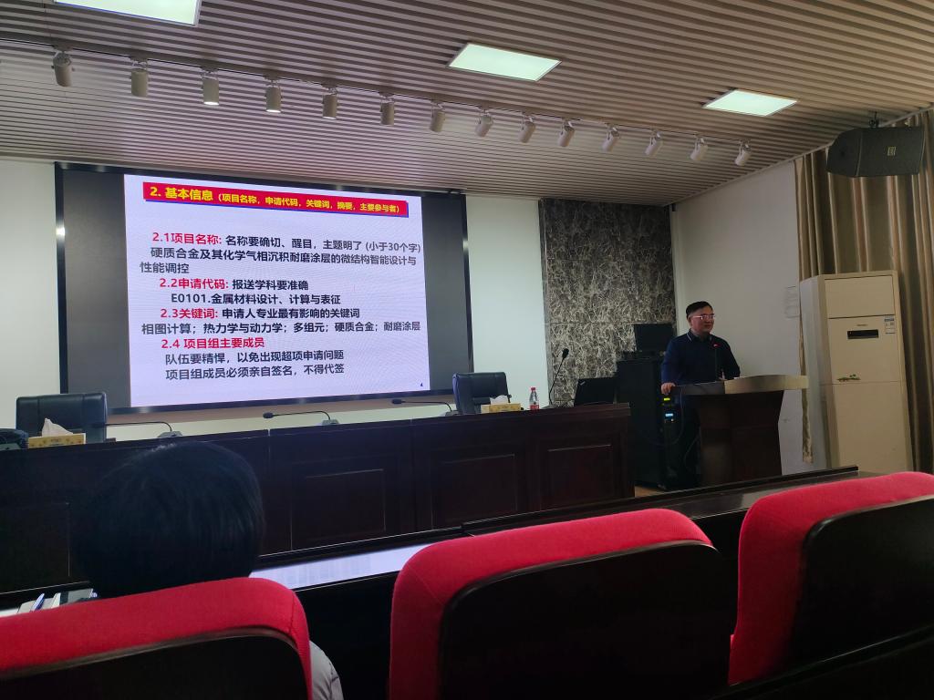 杜勇教授是中南大学二级教授,博士生导师,粉末冶金国家重点实验室副主任,中德电化学存储系统集成计算材料工程联合实验室”和”中德微结构联合实验室”主任,国家杰青,,973首席科学家,国家基金委创新群体负责人。杜教授根据自己多年国家自然科学基金项目申报和研究的经验,从选题、框架设计、项目创新、申报书的细节组织等各个方面与大家分享。老师们认真聆听,还不时与杜教授进行探讨,收获颇丰。随后我院青年教师李茜还将自己成功申报国家自然科学基金青年项目的经验与老师们进行了分享。