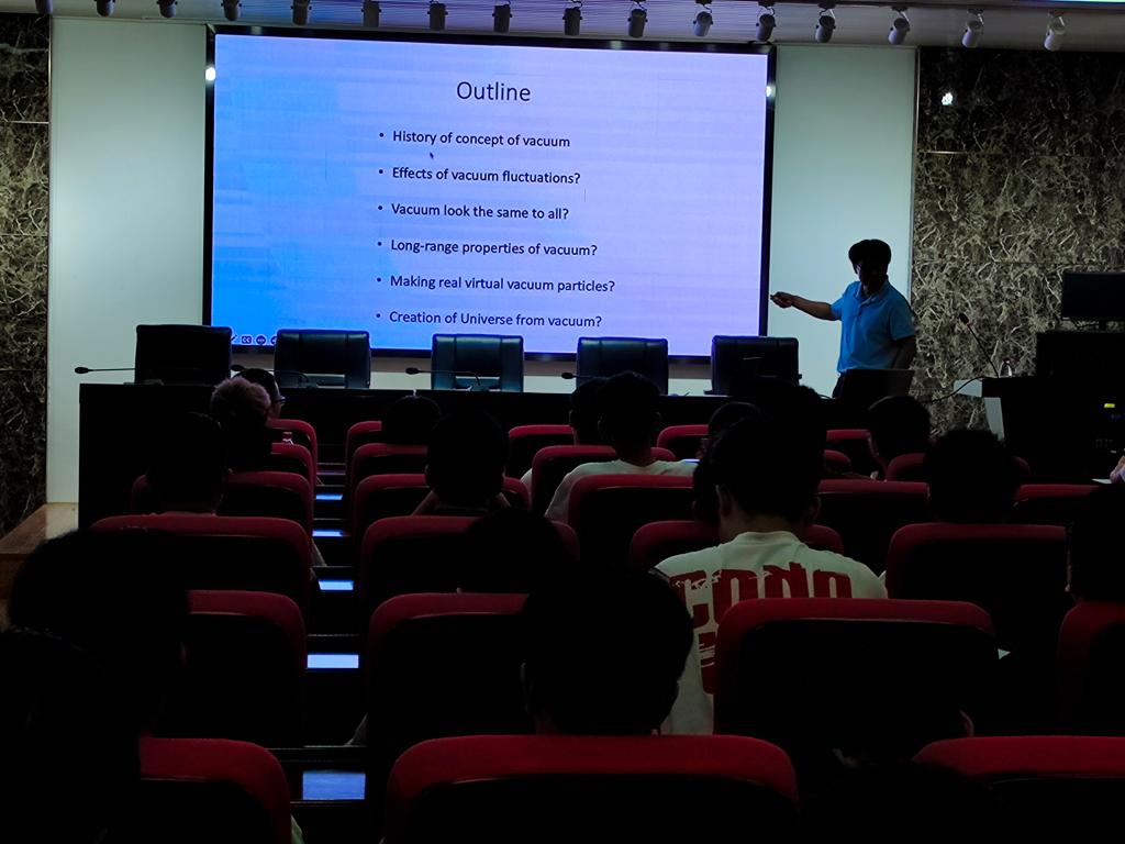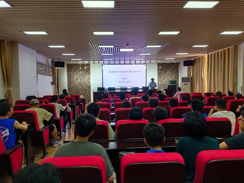 5月29日下午湖南师范大学余洪伟教授应邀来永利官网理科楼B413作了一场题目为“Detecting acceleration-modified vacuum fluctuations (Unruh effect) with quantum entanglement”的学术报告。学院物理专业教师和研究生、本科生共一百余人现场聆听报告,副院长(主持工作)张卫兵主持报告会。