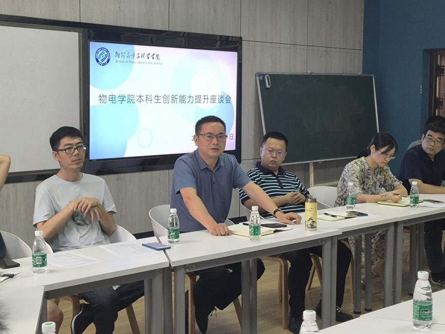 6月16日下午,物电学院在理科楼C509召开本科生创新能力提升主题教育专项调研座谈会。院党委书记张国强、党委副书记宋国宁、副院长范志强、邹望辉老师、尹崇山老师、文勇军老师、卞立安老师、周溯源老师出席了本次会议。34名来自21、22级的科技委员、科技部成员参加了会议。