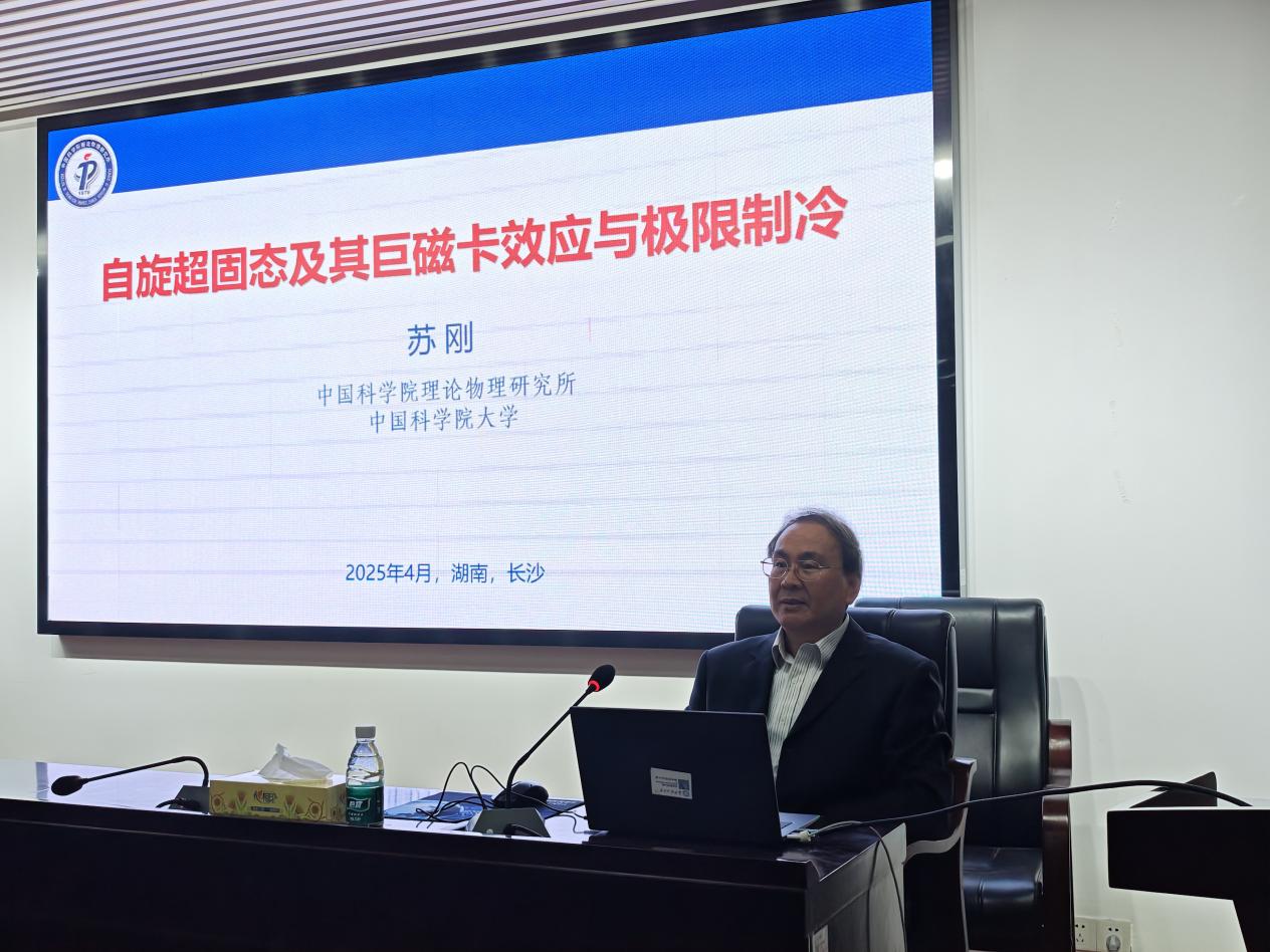 2025年4月26日下午,中国科学院理论物理研究所苏刚教授应邀来永利官网交流指导,在理科楼B413会议室作了题为《自旋超固态及其巨磁卡效应与极限制冷》的学术报告。我院六七十余名师生积极参加了此次学术报告会,会议由邓科教授主持。