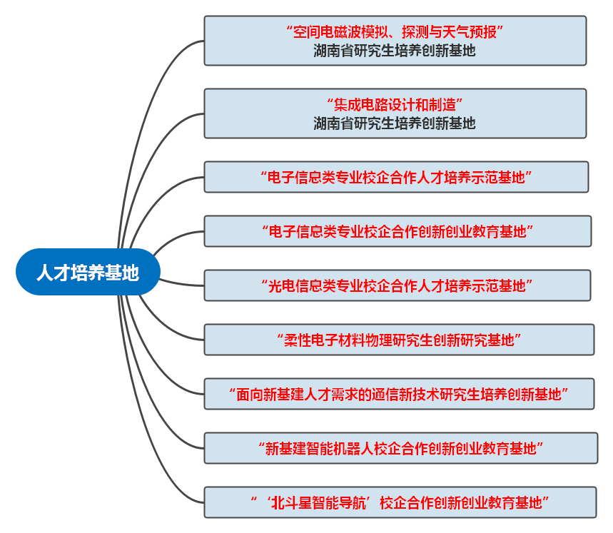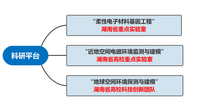 学院拥有“电子科学与技术”湖南省“十二ˑ五”重点学科、“柔性电子材料基因工程”湖南省重点实验室、“近地空间电磁环境监测与建模”湖南省高校重点实验室、“地球空间环境探测与建模”湖南省高校科技创新团队。同时拥有“空间电磁波模拟、探测与天气预报”湖南省研究生培养创新基地、“集成电路设计和制造”湖南省研究生培养创新基地、“电子信息类专业校企合作人才培养示范基地”、“电子信息类专业校企合作创新创业教育基地”、“光电信息类专业校企合作人才培养示范基地”、“柔性电子材料物理研究生创新研究基地”、“面向新基建人才需求的通信新技术研究生培养创新基地”、“新基建智能机器人校企合作创新创业教育基地”、等9个省级人才培养平台。