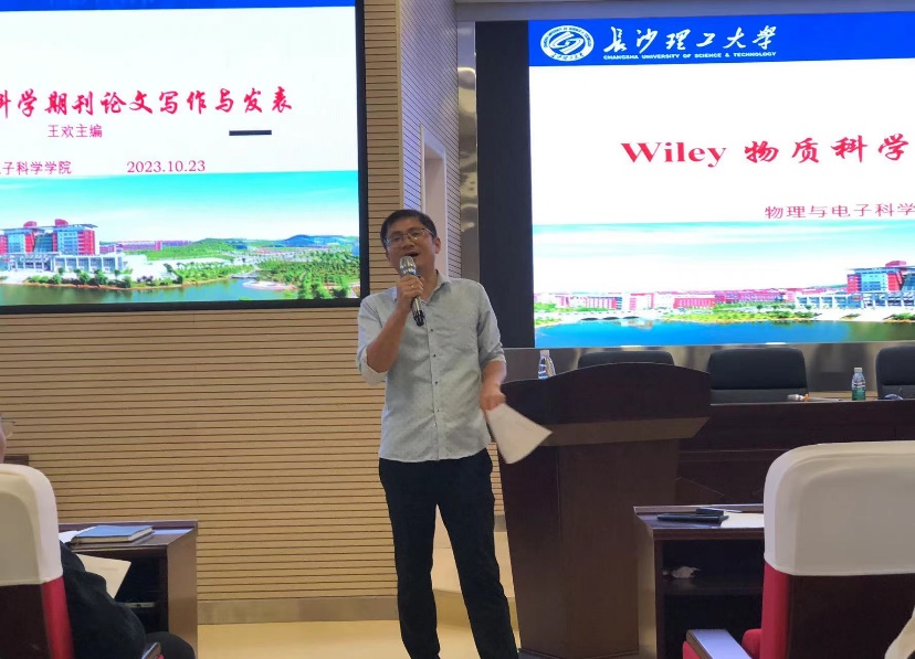 2023年10月23日下午,Wiley主编王欢来我院作了《Wiley物质科学期刊论文写作与发表》的学术讲座。讲座在理科楼A200会议室进行,学院部分本科生、研究生和教师参加,张卫兵副院长(主持工作)主持讲座。