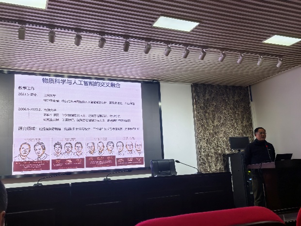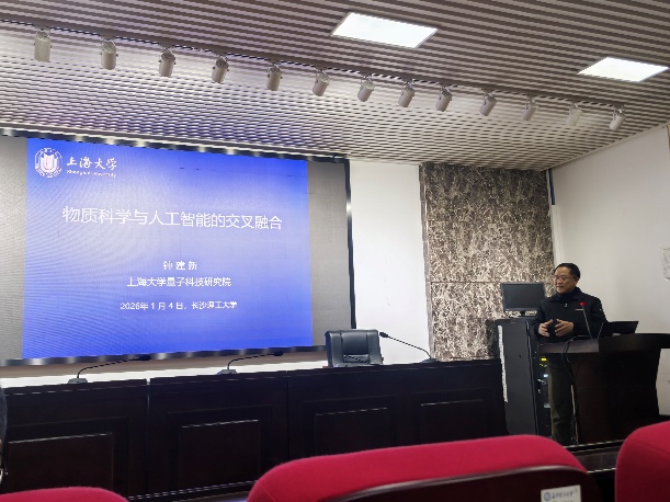 2026年1月4日下午,新年伊始学院邀请上海大学钟建新教授在理科楼B413作题为《物质科学与人工智能的交叉融合》的学术报告。本次报告由邓科教授主持,吸引了本院师生踊跃参与。