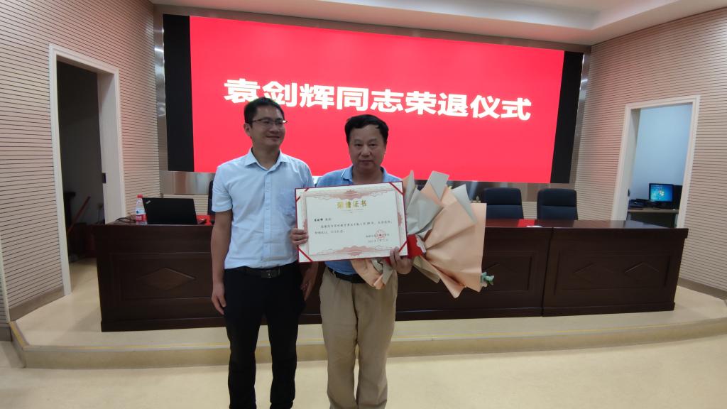 学院党委副书记宋国宁和副院长兼分工会主席刘斯代表学院全体老师向袁剑辉教授献上鲜花和礼品。张卫兵副院长为袁剑辉教授颁发了荣退证书,他对袁教授为学院做出的贡献表示感谢,并送上温暖的祝福。袁剑辉教授非常感动,现场发表感言,他回顾了自己从教30余年的工作经历,有喜悦、有幸福、有感动,也有遗憾。他对在座的年轻人寄予希望,勉励他们努力奋斗,无悔青春;他感谢学校和学院的关心和关爱,祝福学校和学院将来取得更加辉煌的成绩。