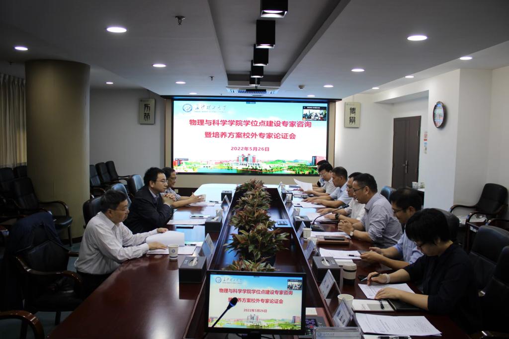 物电学院副院长张卫兵向与会专家详细汇报了物理学学位点建设和培养方案修订的基本情况,与会专家充分肯定了物理学学位点建设与发展取得的成绩,并从专业方向、学科特色、学科团队、招生规模、培养目标、课程设置以及毕业要求等方面提出了宝贵的意见与建议。