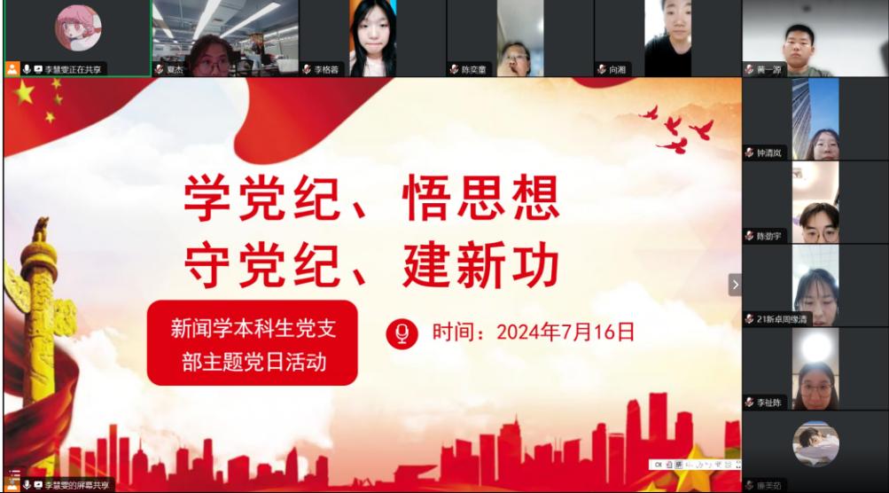 为深入推进主题教育,感悟思想伟力,严格落实“三会一课”,夯实支部“一月一课一片一实践”活动要求,2024年715-18日,文新学院各学生党支部开展以“学党纪悟思想守党纪建新功”为主题的7月党日活动。