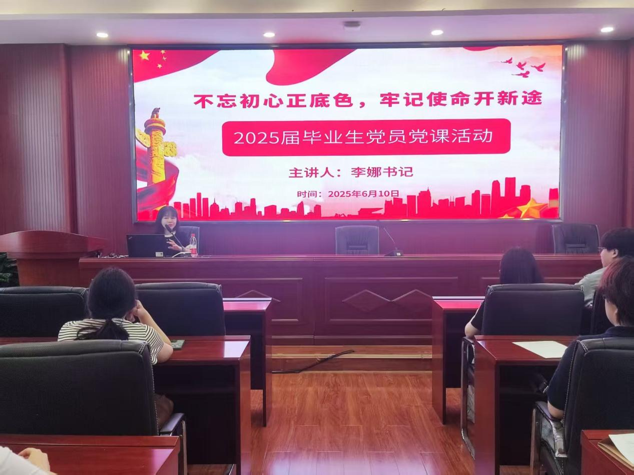 为进一步加强毕业生党员党性教育和党纪教育,激励他们坚定理想信念,牢记党员责任,6月10日下午,永利集团88304官网文学与新闻传播学院在金盆岭校区9号教学楼218教室举行2025届毕业生党员党课活动,2025届全体毕业生党员参会,学院党委副书记(主持工作)李娜以《不忘初心正底色,牢记使命开新途》为题,为全体毕业生党员上专题党课。