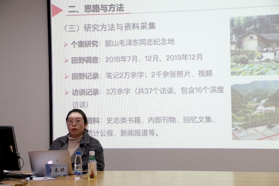 主题演讲环节中,王春晓从社会空间理论和媒介地理学非表征理论出发,将空间视为文化意义的承载体和传播媒介,以韶山毛泽东纪念地为案例,综合运用田野观察、访谈等质化研究方法,探讨了当代红色文化空间中的意义实践图景,以期为突破红色文化传播困境、凝聚文化认同提供借鉴。
