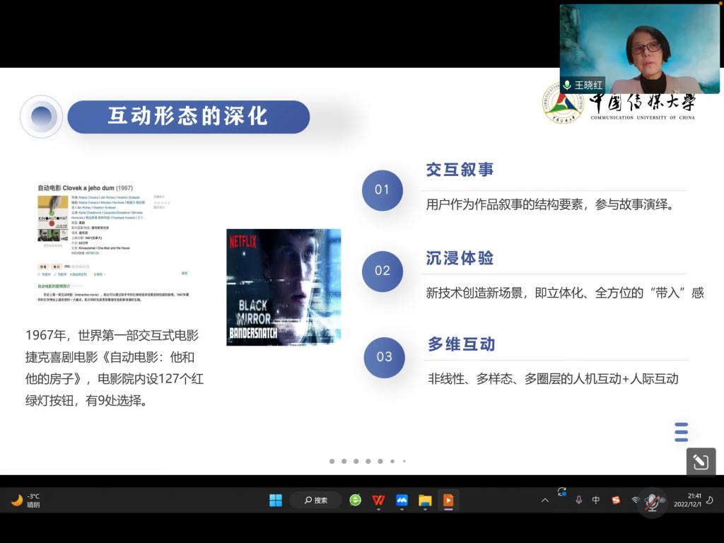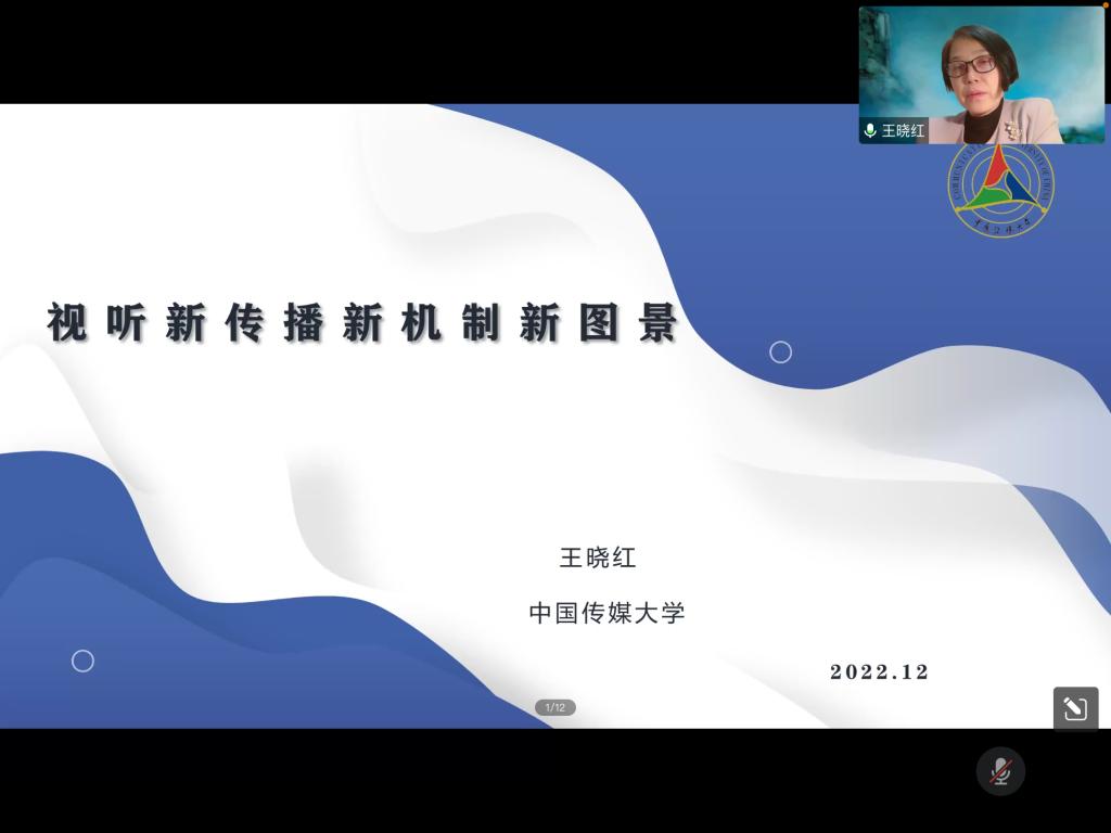 2022年12月1日晚,第十四届研究生云影讲坛文学与新闻传播学院分论坛第五期如期举行。中国传媒大学本科生院院长王晓红教授应邀为永利官网师生开展主题为“视听新传播新机制新图景”的讲座。本次讲座以线上的方式进行,院长刘建新教授担任主持,赵继光老师、陈健强老师参与讲座。