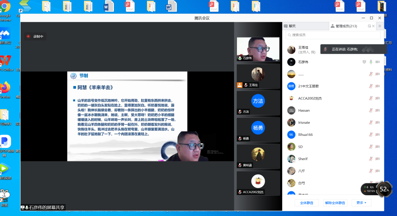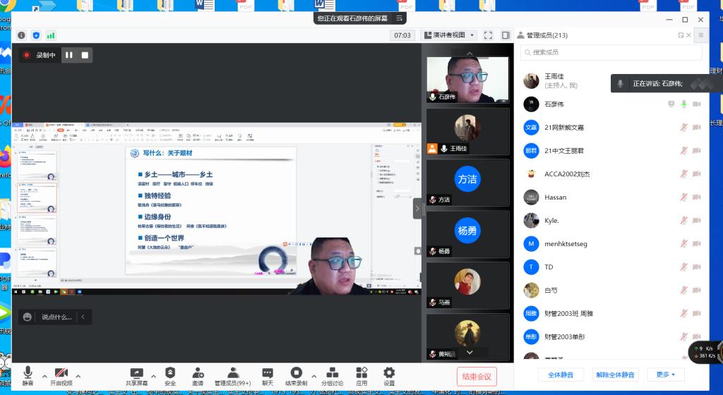 2021年10月29日晚19:00,青年作家石彦伟受邀为我院师生开展了以“散文创作理路与技法”为主题的线上讲座。本次讲座由文学与新闻传播学院王雨佳老师主持,此次会议得到了永利官网师生及石彦伟老师的作家朋友的热烈响应,共有220人参与讲座。