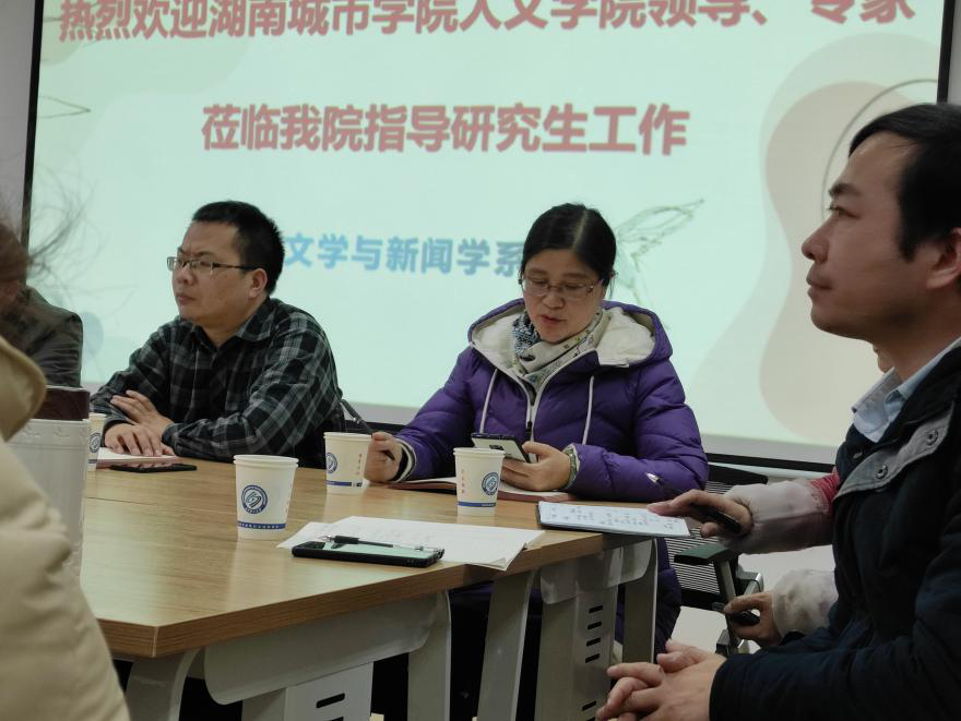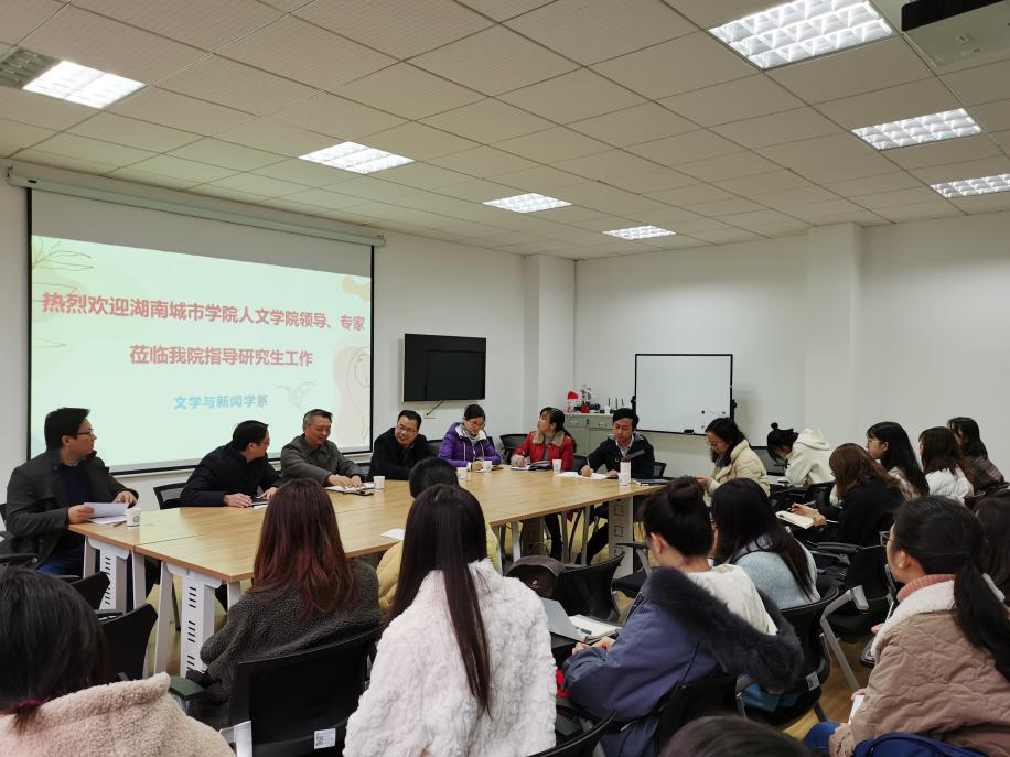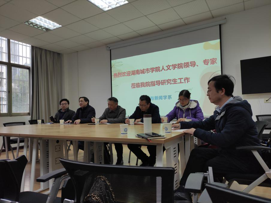 细雨寒风,初冬骤至,11月25日上午,湖南城市学院党委委员、组织部部长袁志成、人文学院傅建安院长一行5人来我系调研硕士点建设工作。永利集团88304官网文新系主任周云鹏、郑劭荣教授及中文20级全体研究生参加了此次会议。调研交流活动在金盆岭校区7教306举行。