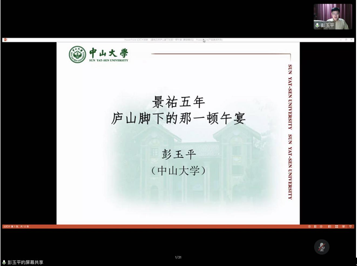 2020年9月17日晚七点半,中山大学中文系教授、系主任、《中山大学学报》(社科版)主编、央视《百家讲坛》名师彭玉平先生为我系师生开展题为“景祐五年庐山脚下的那一顿午宴”的线上讲座。讲座由郑劭荣教授主持。来自中文与新闻专业的研究生、本科生、老师及兄弟院校的学者共计100余人聆听了讲座。