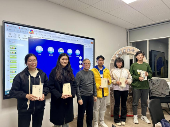 在交流过程中,成教授即兴展示了经典记诵的扎实功底,并与现场同学展开了诗词背诵接龙挑战。范仲淹名篇《岳阳楼记》的吟诵声伴随着大家的欢声笑语在室内回响。随后,成教授向背诵得最流利的同学当场签赠专著,现场气氛达到高潮。